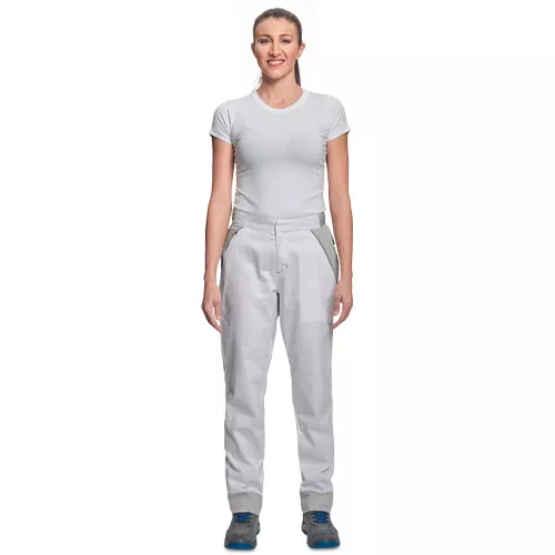 • női munkanadrág könnyű pamut-PES kevertszálas anyagból • dekoratív paszpol kontrasztos színekkel • légáteresztő, köszönhetően hálós betéteknek • teljesen fedett cipzár és zsebek • a derékbőség állítható az oldalán található tépőzárnak köszönhetően • a nadrágszárak hossza 5 cm-rel eghosszabbítható • 2 oldalsó zseb, az egyikben D-gyűrű található • 1 hátsó zseb • tartós anyagú • puhább, hajlékonyabb szövet