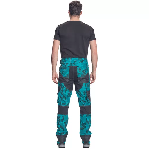 férfi munkanadrág innovatív, rugalmas TRIFIBETEX® anyagból, CORDURA® betétekkel digitális terepmintával, elöl 2 ékzseb, hátul 2 tépőzáras foltzseb, bal oldalt nagy multifunkciós zseb, jobb oldalt multifunkciós vonalzó, kés és ceruzatartó, fém "D" gyűrű, rugalmas derék, hosszabbítható szárhossz, fényvisszavető elemek, dekoratív tripla varrás kontrasztos színnel, kalapácstartó