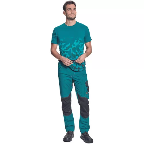 • férfi munkanadrág innovatív rugalmas Trifibetex® anyagból CORDURA® betétekkel • elöl 2 ékzseb • hátul 2 tépőzáras foltzseb • bal oldalon nagy multifunkciós zseb • jobb oldalon multifunkciós zseb vonalzónak • kés- és ceruzatartó • fém "D" gyűrű • rugalmas derék