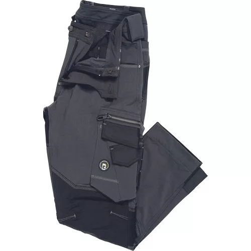 férfi munkanadrág innovatív, rugalmas TRIFIBETEX PRO® anyagból, elöl 2 ékzseb, hátul 2 tépőzáras foltzseb, bal oldalt nagy multifunkciós zseb, jobb oldalt multifunkciós vonalzó, kés és ceruzatartó, fém "D" gyűrű, rugalmas derék, hosszabbítható szárhossz, fényvisszavető elemek, dekoratív tripla varrás kontrasztos színnel, kalapácstartó