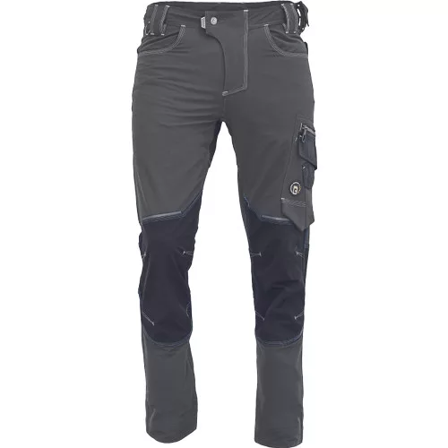 férfi munkanadrág innovatív, rugalmas TRIFIBETEX PRO® anyagból, elöl 2 ékzseb, hátul 2 tépőzáras foltzseb, bal oldalt nagy multifunkciós zseb, jobb oldalt multifunkciós vonalzó, kés és ceruzatartó, fém "D" gyűrű, rugalmas derék, hosszabbítható szárhossz, fényvisszavető elemek, dekoratív tripla varrás kontrasztos színnel, kalapácstartó