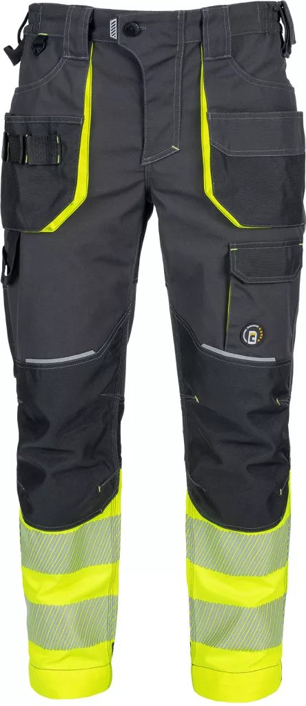 • Férfi jólláthatósági nadrág rugalmas derékkal és többfunkciós zsebekkel, 7 cm-es szegmentált fényvisszavető csíkokkal. Megerősített térdrész és térdzseb Oxford 600D anyagból térdvédő behelyezéséhez. Ellenálló hármas fedőző varrás az üleprészen és a meghosszabbítható szárakon.