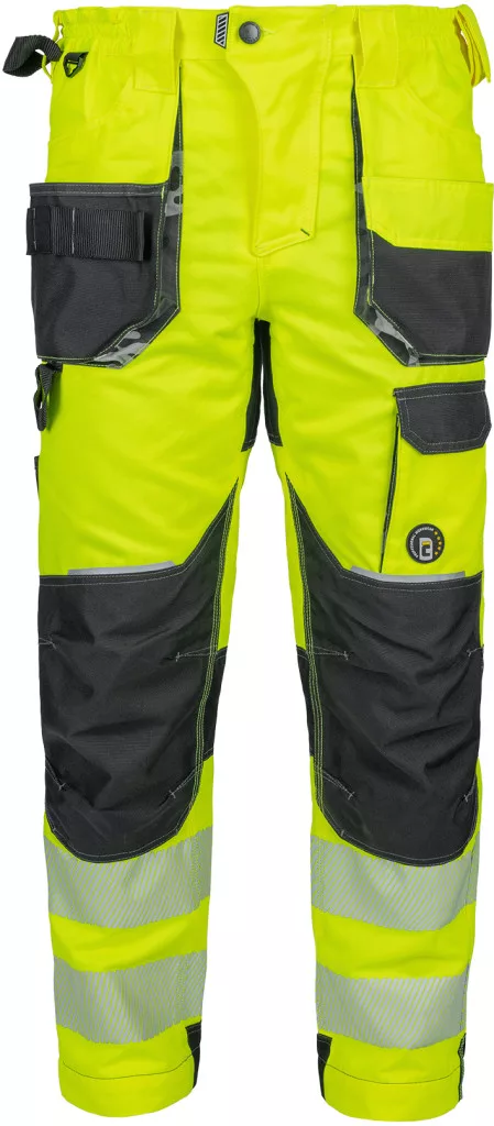 • férfi jólláthatósági nadrág rugalmas derékkal és többfunkciós zsebekkel, 7 cm-es nyomtatott fényvisszavető csíkokkal • megerősített térdrész és térdzseb Oxford 600D anyagból térdvédő behelyezéséhez • ellenálló hármas fedőző varrás az üleprészen és a meghosszabbítható szárakon