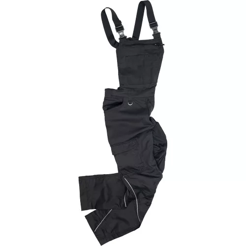 • modern szabású mellesnadrág formázott oldalvarrásokkal, állítható, rugalmas vállpántokkal, nagy, rejtett cipzáras mellzseb, zsebek mobiltelefonnak, tollaknak, rugalmas, szűkíthető derékpánt, megerősítés a térdrészen, rugalmas betétek hátul és az üleprészen, 2 D- gyűrű (nikkelmentes) a derékpánton, 2 első zseb, 2 zsebfedős oldalzseb, a bal száron extra cipzáras zseb (reflex cipzár), többfunkciós zsebek szerszámoknak, 2 farzseb, jobb oldalon zsebfedős, tépőzáras záródással, fényvisszavető részletek