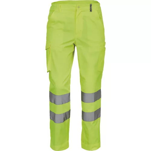 • férfi munkanadrág 7 cm széles fényvisszavető csíkokkal és HI-VIS elemekkel • 2 oldalsó zseb + 1 érmezseb • 2 oldalzseb • 2 hátsó zseb • rugalmas oldalsó betétek a derékon • meghosszabbítható szárhossz