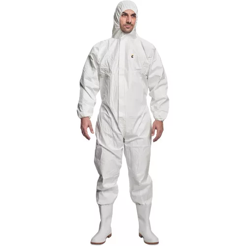 Csuklyás antisztatikus védőoverall mikroporózus páraáteresztő réteggel, elülső cipzár csappantyúval, valamint gumival összehúzható ujjal és nadrágszárral. Az öltözék a CE III. osztályba, az 5., és 6. típusba tartozik, és számos vegyszernek, valamint radioaktív szemcsék és fertőző anyagok behatolásának is ellenáll.