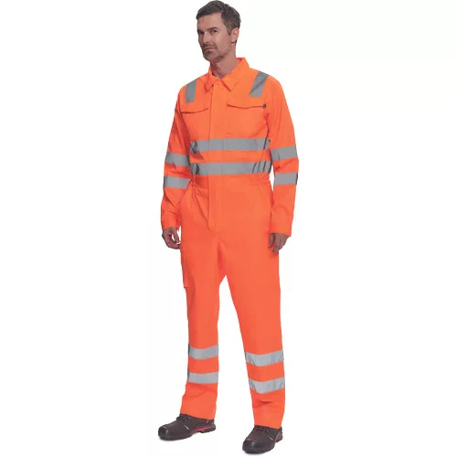 • férfi Hi-Vis overall 5 cm széles fényvisszavető csíkokkal • hajtókával fedett cipzár • 2 első zseb, 1 érmezseb • 1 multifunkciós oldalzseb a száron • 2 hátsó zseb • 2 zsebfedős mellzseb • rugalmas betét a derékrészen • leengedhető szárak