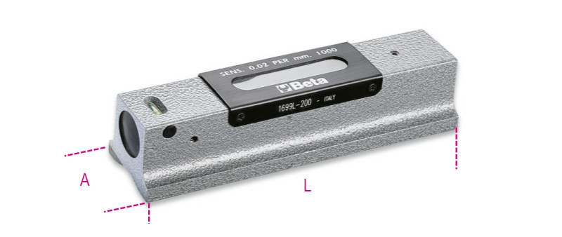1699L/1 Precíziós vízmérték kokillaöntvény, köszörült prizmaalaplappal, 2 törésbiztos libella, fadobozban, pontosság: 0.02 mm/m