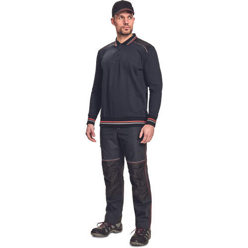 • pamut - PES kevertszálas férfi pulóver • puha francia frottír belső • kontrasztos fekete vállrész, fényvisszavető szegéllyel • 3 gombos nyakkivágás, kontrasztos csíkok a galléron