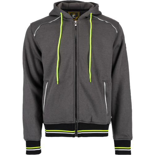 Kevertszálas kapucnis kardigán cipzárral. Bolyhosodásmentes francia frottír szövet belső, fényvisszavető elemekkel díszített oldalzsebek, kétrétegű kapucni, dekoratív tűzések. Rugalmas mandzsetta és alsó szegély.