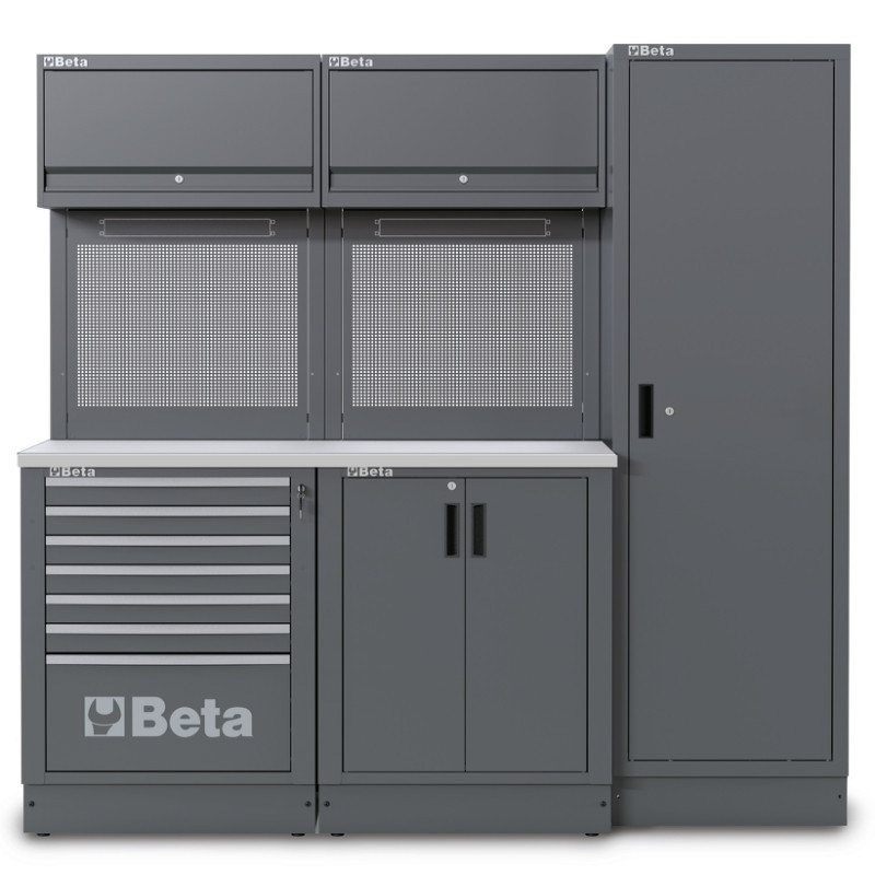 Az összeállítás a következőkből áll: • 1 db rozsdamentes acéllal fedett MDF munkalap, 1495 mm x 700 mm (RSC50 2.0 PX/2-1.5MT) • 1 db 7 fiókos rögzített modul (RSC50 2.0 M7) • 1 db rögzített, kétajtós modul (RSC50 2.0 MA) • 2 db faliszekrény (RSC50 2.0 PM) • 2 db felső perforált szerszámtartó panel (RSC50 2.0 PFS) • 2 db alsó perforált szerszámtartó panel (RSC50 2.0 PFI) • 2 pár jobb- és baloldali konzol (RSC50 2.0 P/2MDX-SX) • 1 db egyajtós szerszámos szekrény (RSC50 2.0 A1)