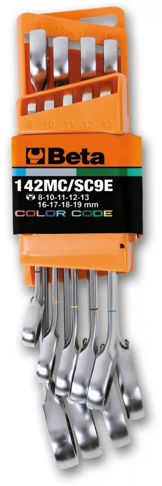 9 darabos színezett csillag-villáskulcs készlet irányváltós racsnival, kompakt tartóval