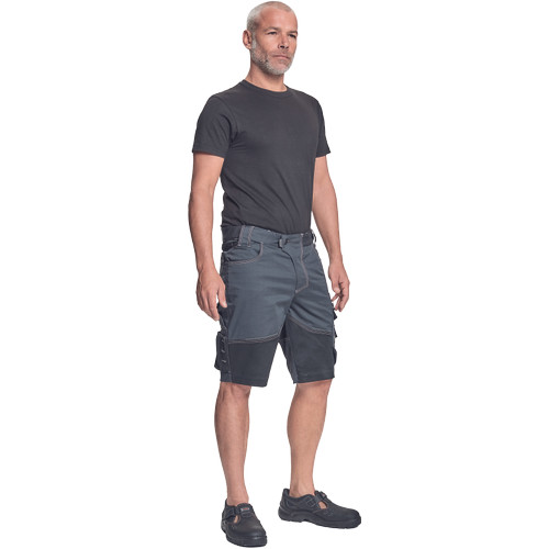 • férfi rövidnadrág innovatív, rugalmas Trifibetex® anyagból • 2 ékzseb • hátul 2 tépőzáras foltzseb • bal oldalon nagy multifunkciós zseb • jobb oldalon multifunkciós zseb vonalzónak • kés- és ceruzatartó • fém "D" gyűrű • rugalmas derék • fényvisszavető részletek • dekoratív tripla varrás kontrasztos színnel • kalapácstartó