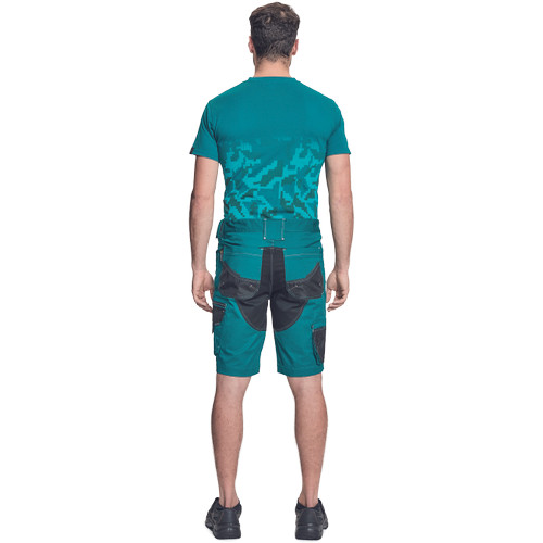 • férfi rövidnadrág innovatív, rugalmas Trifibetex® anyagból • 2 ékzseb • hátul 2 tépőzáras foltzseb • bal oldalon nagy multifunkciós zseb • jobb oldalon multifunkciós zseb vonalzónak • kés- és ceruzatartó • fém "D" gyűrű • rugalmas derék • fényvisszavető részletek • dekoratív tripla varrás kontrasztos színnel • kalapácstartó