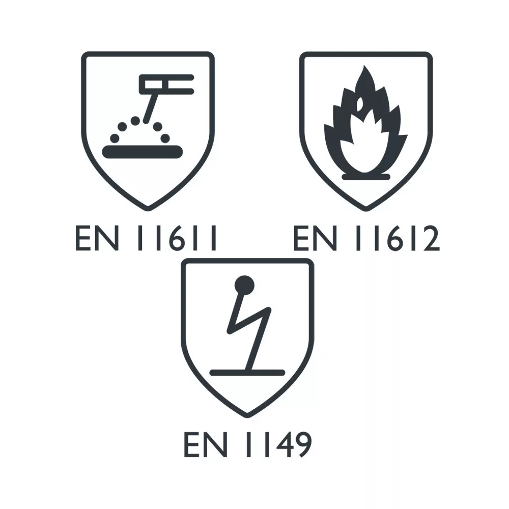 Egyenes szabás, funkcionális kialakítás. - antisztatikus - lángálló - sugárzó hőnek ellenálló (hegesztő) - patentos záródás - galléros nyak - két oldalzseb - tépőzáras belső zseb - patentos mandzsetták - a csípőnél tépőzáras állítási lehetőség - fedővarrás lángálló szálakkal - EN 1149-5:2018 - EN ISO 11611:2015 Klasa 1, A1+A2 - EN ISO 11612:2015 A1+A2, B(1), C(1), E(1), F(1)