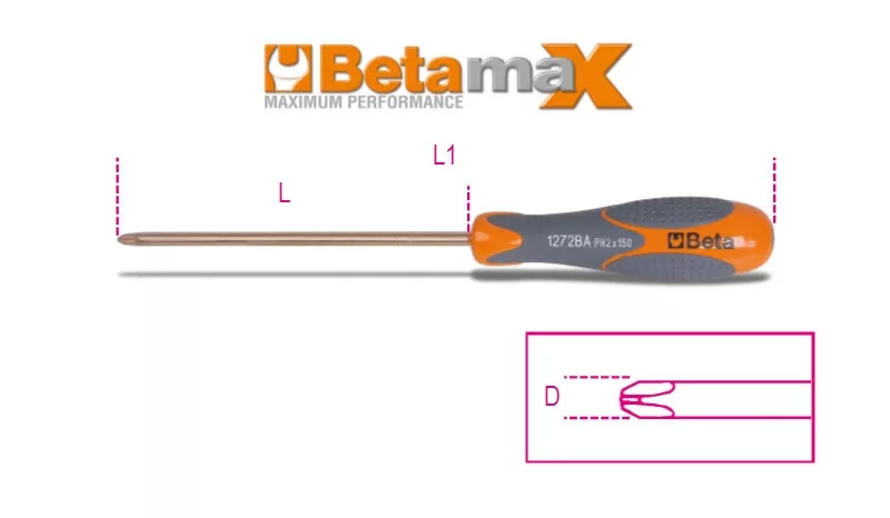 Csavarhúzó Phillips®-csavarokhoz, szikramentes • Réz-berillium ötvözet (CU-BE) • A Beta szikramentes szerszámokat a BAM (Szövetségi Anyagkutató és Vizsgáló Intézet) a 99/92/EC Európai Irányelvnek megfelelően tanusítja.