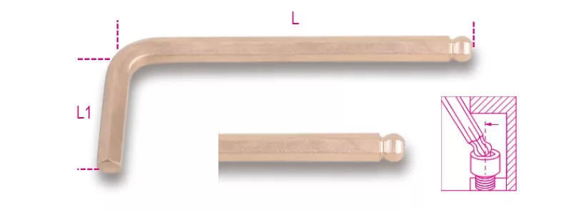 Hajlított gömbfejű imbuszkulcs, szikramentes • Réz-berillium ötvözet (CU-BE) • A Beta szikramentes szerszámokat a BAM (Szövetségi Anyagkutató és Vizsgáló Intézet) a 99/92/EC Európai Irányelvnek megfelelően tanusítja.
