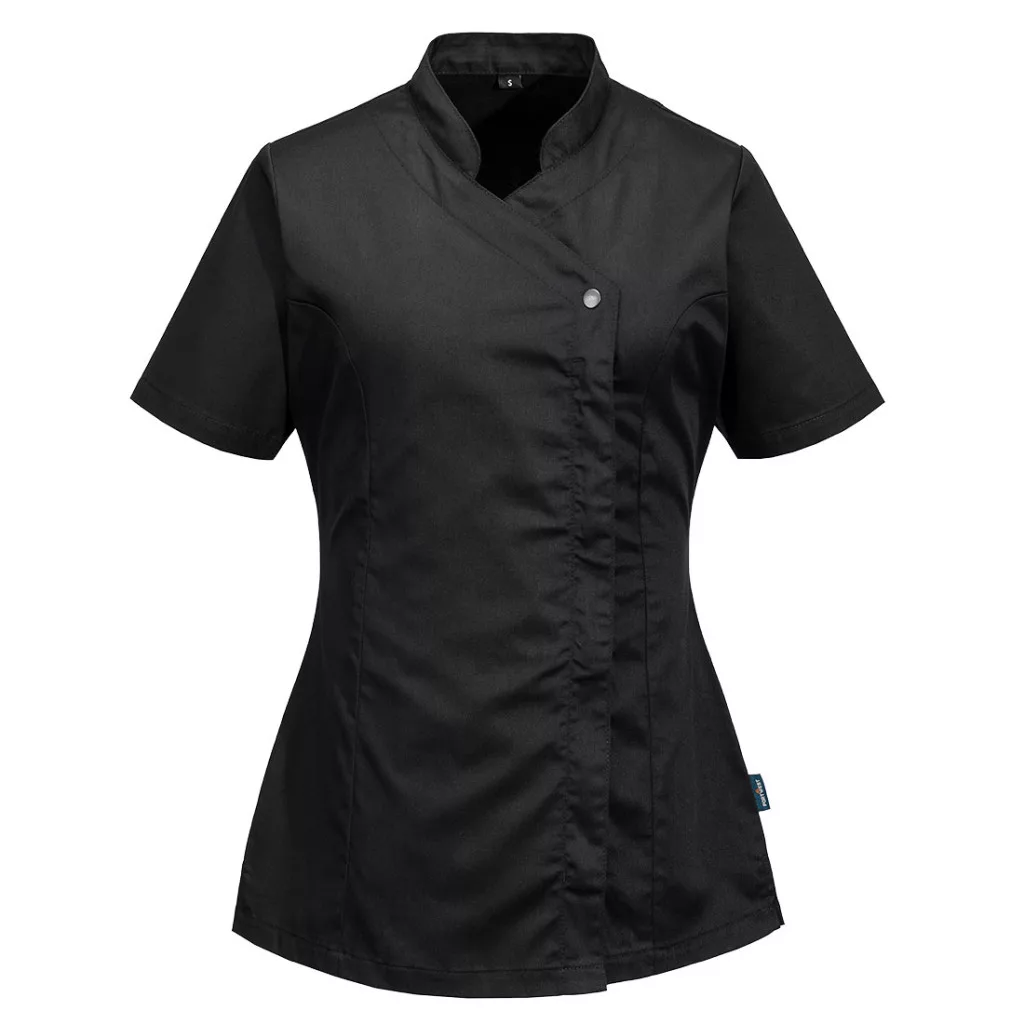 Ez a női tunika elöl patentos, rejtett cipzárral záródik. Az oldalsó sztreccs anyag használata a könnyű mozgás érdekében, valamint az oldalsó szellőzőnyílások és a fekete redő teszi ezt a ruhadarabot praktikussá, miközben megtartja a stílust.
