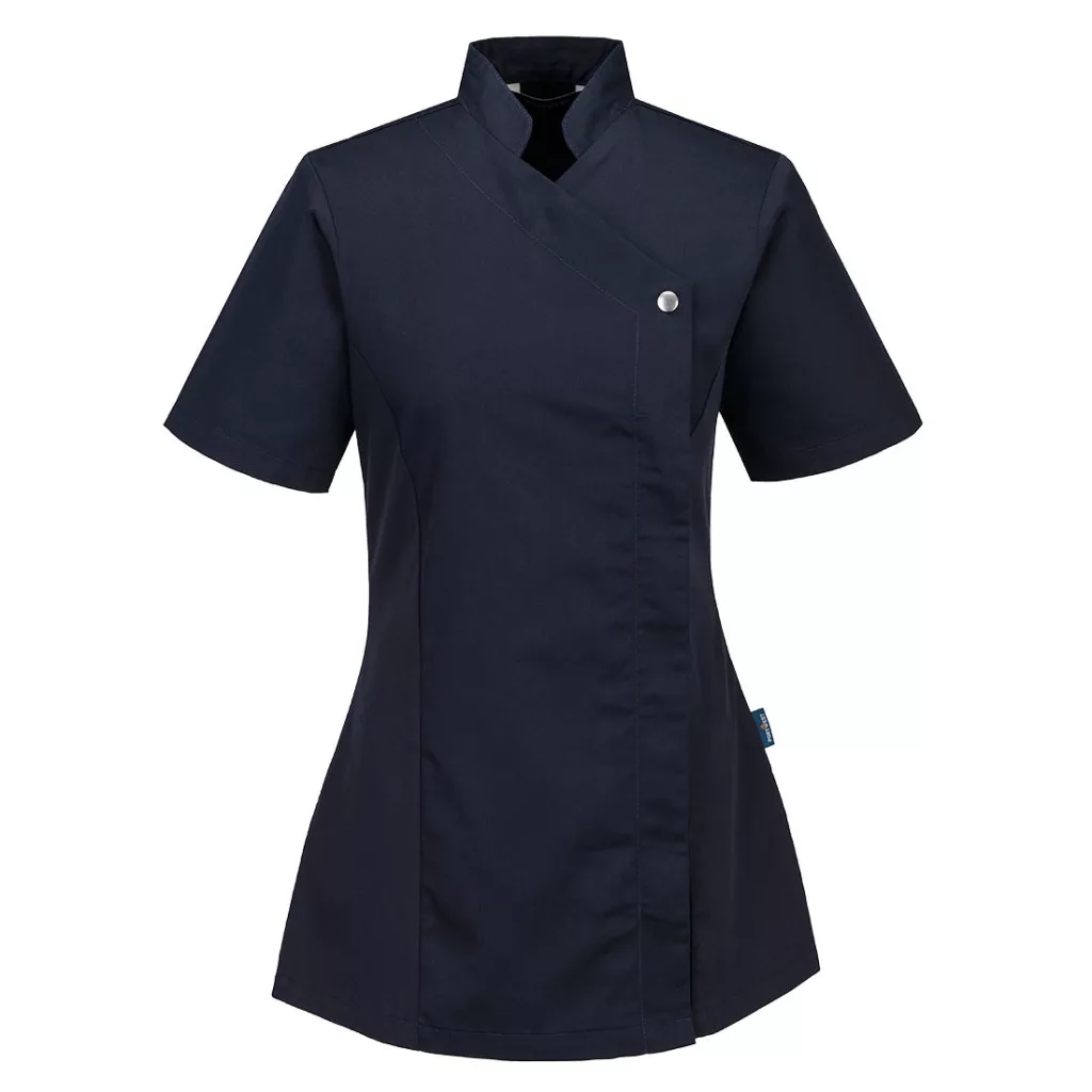 Ez a női tunika elöl patentos, rejtett cipzárral záródik. Az oldalsó sztreccs anyag használata a könnyű mozgás érdekében, valamint az oldalsó szellőzőnyílások és a fekete redő teszi ezt a ruhadarabot praktikussá, miközben megtartja a stílust.
