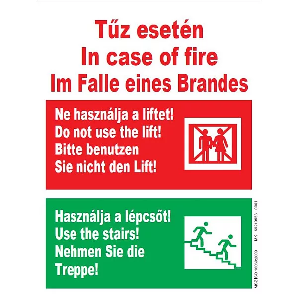 Tűz esetén ne használd a liftet - 3 nyelvű UV tábla
