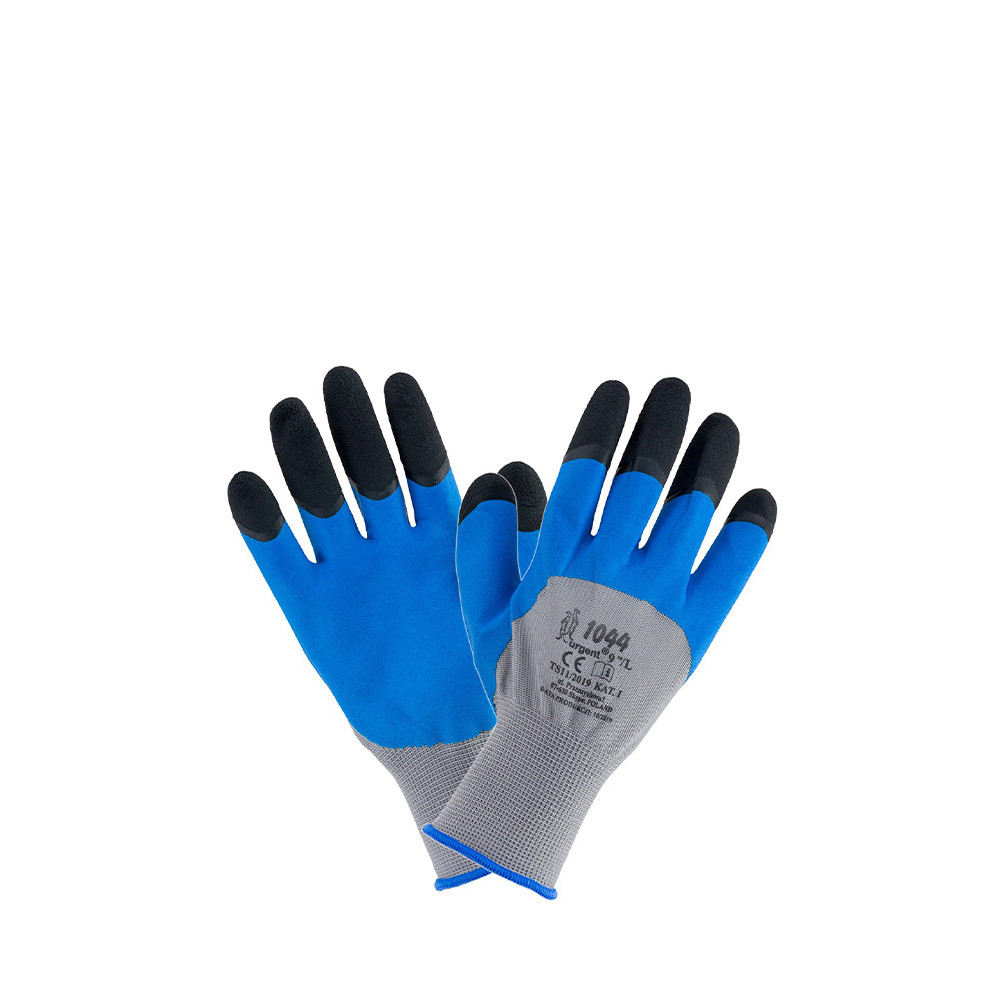 Poliészter alapanyagra ökölcsontig mártott védőkesztyű, habosított gumi mártással, ujjbegyeken dupla latex bevonattal és gumírozott mandzsettával.