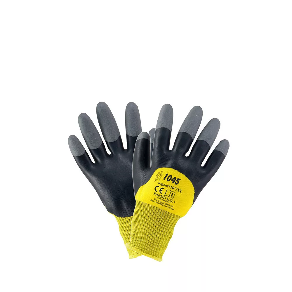 Poliészter alapanyagra ökölcsontig mártott védőkesztyű, latex mártással, ujjbegyeken habosított latex bevonattal és gumírozott mandzsettával.