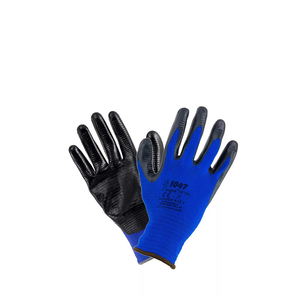 Poliészter alapanyagra ujjbegyig mártott védőkesztyű, vastag érdes nitril mártással és gumírozott mandzsettával.