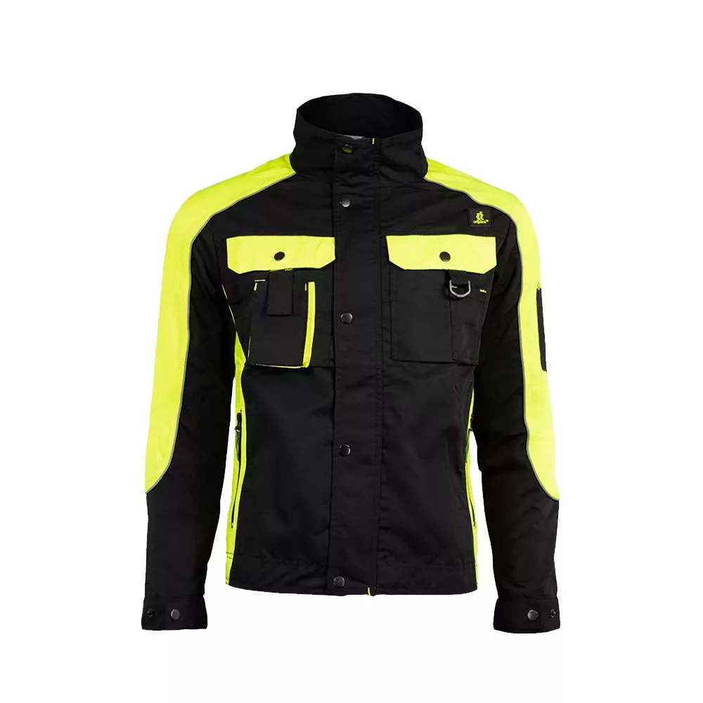 Egyenes szabás, funkcionális kialakítás, erősített anyag. - fényvisszaverő elemekkel - cipzáras záródás, patentos cipzárfedővel - állógalléros nyak kialakítás - két első zseb - két zsebfedős mellzseb - D gyűrű - telefon számára kialakított zseb - rugalmas, gombos mandzsetták