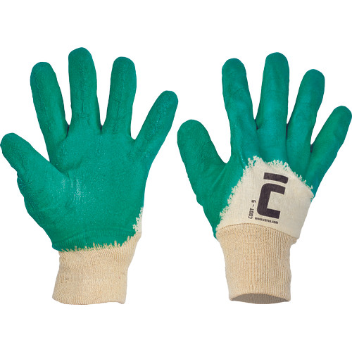 • kötött pamutkelméből varrt védőkesztyű • latex mártott tenyér és ujjak csúszásgátló felülettel és rugalmas kötött mandzsettával
