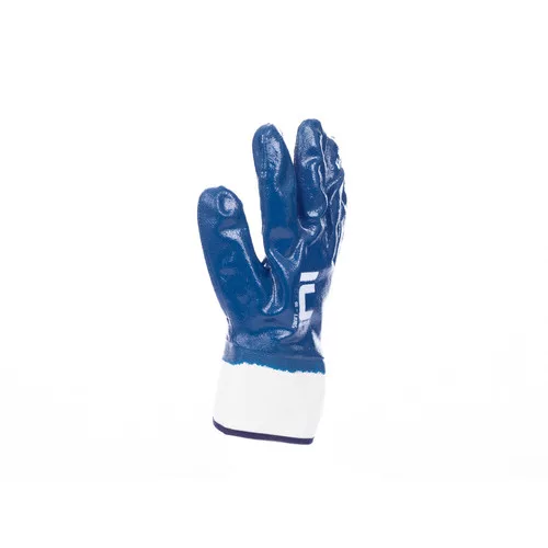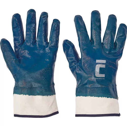 • kötött pamutkelméből varrt, nitrilbe teljesen mártott kék kesztyű merev mandzsettával