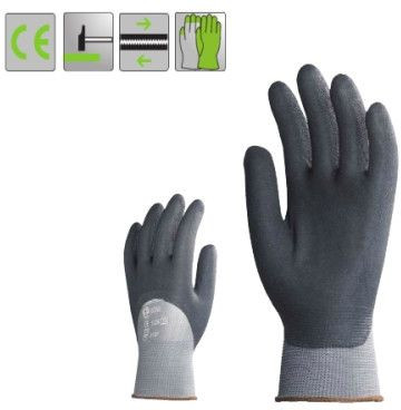•- tenyéren, plusz a kézháton 3/4-ig mikro habosított fekete poliuretán, környezet- és bőrbarát, vízbázisú technológiával mártva
