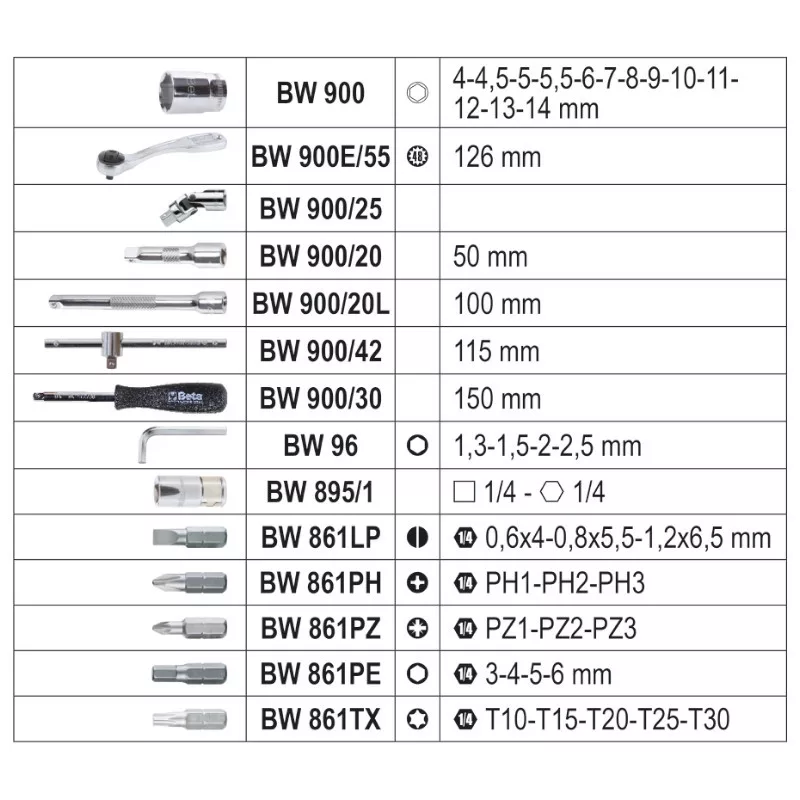 13 hatlapfejű dugókulcs, 18 csavarhúzóbetét, 4 hajlított imbuszkulcs és 7 tartozék készlet műanyag dobozban BW 900 4-4,5-5-5,5-6-7-8-9-