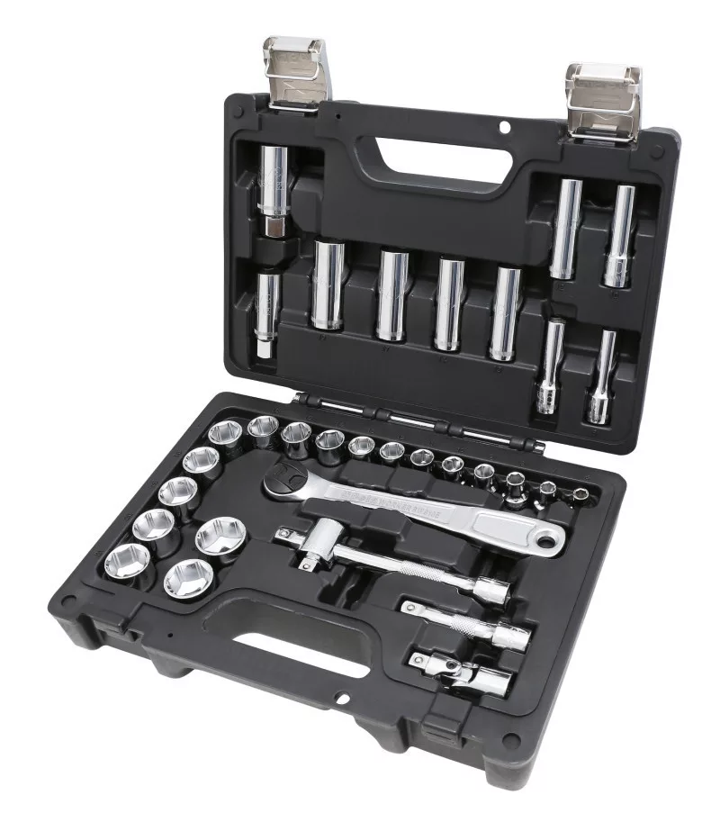28 hatlapfejű dugókulcs és 5 tartozék készlet műanyag dobozban