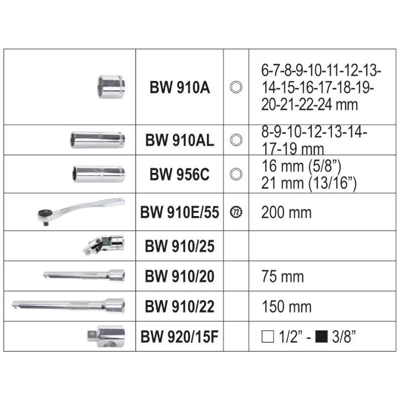 BW 910A 6-7-8-9-10-11-12-13-14-15-16-17-18-19-20-21-22-24 mm BW 910AL 8-9-10-12-13-14-17-19 mm BW 956E 16 mm (5/8”) 21 mm (13/16”) 910/55 BW 910/25 BW 910/21 75 mm BW 910/22 150 mm BW 920/15F 1/2” - 3/8”
