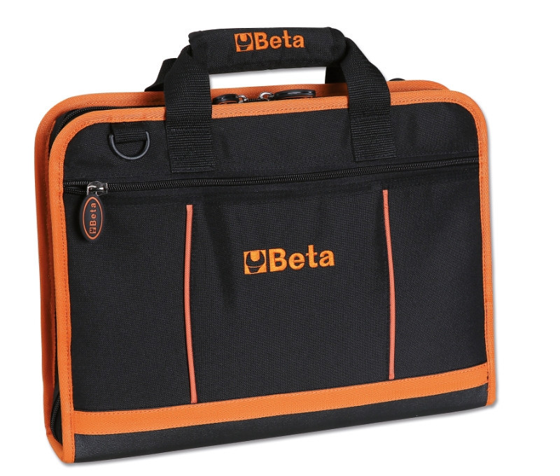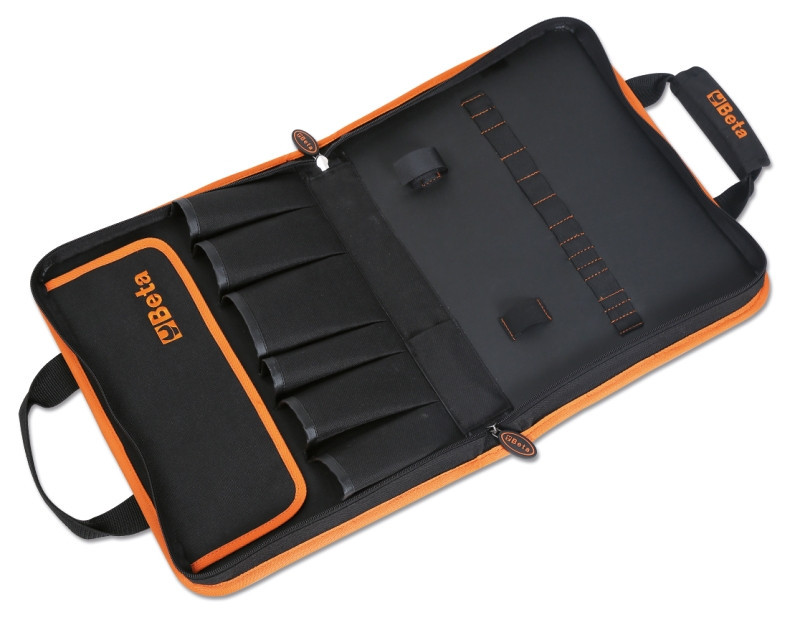 • Dupla felső pánt az optimális fogáshoz • Elülső cipzáros dokumentumtároló zseb • A hátoldalon elhelyezett tépőzáras pánttal a táska a kocsi fogantyújára rögzíthető • 20 kényelmes szerszámosrekesz (6 zseb és 14 gumipánt) • Kalapácstartó fülek • C9/RT vállszíjjal is kapható (külön kell megrendelni)