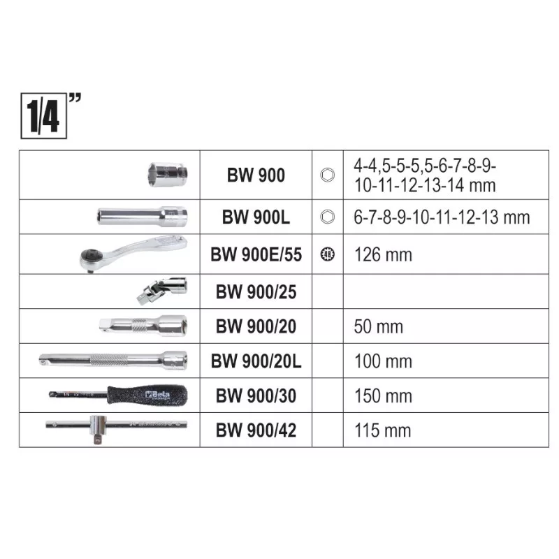 BW 900 4-4,5-5-5,5-6-7-8-9-10-11-12-13-14 mm BW 900L 6-7-8-9-10-11-12-13 mm 900/55 BW 900/25 BW 900/20 50 mm BW 900/20L 100 mm BW 900/30 150 mm BW 900/42 115 mm BW 920A 10-11-12-13-14-15-16-17-18-19-20-21-22-24-27-30-32 mm BE 920AL 14-15-17-19-22 mm BW 956C 16 mm (5/8”) - 21 mm (13/16”) 920/55 BW 920/25 BW 920/21 125 mm BW 920/22 250 mm BW 910/16F 3/8” - 1/2” BW 895/6 1/2” - 5/16” BW 895/1 BW 892/0 1/4” - 1/4” BW 861PH PH1-PH2 BW 861PZ PZ1-PZ2 BW 861PE 3-4-5-6 mm BW 861LP 0,6x4-0,8x5,5-1,2x6,5 mm BW 861TX T10-T15-T20-T25-T27-T30 BW 866LP 1,6x8-1,6x10-2,0x12 mm BW 866PH PH3-PH4 BW 866PZ PZ3- PZ4 BW 866PE 7-8-10-12-14 mm BW 866TX T40-T45-T50-T55-T60-T70 BW 42 7-8-9-10-11-12-13-14-15-16-17-18-19 mm BW 96/SC9 1,5-2-2,5-3-4-5-6-8-10 mm