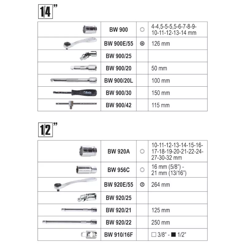 BW900 4-4,5-5-5,5-6-7-8-9-10-11-12-13-14 mm 900E/55 BW900/25 BW900/20 50 mm BW900/20L 100 mm BW900/30 150 mm BW900/42 115 mm BW861LP 0,5x3-0,6x4,5-0,8x5,5-1,0x5,5-1,2x6,5-1,6x8 mm BW861TX T8-T9-T10-T15-T20 T25-T27-T30-T40 BW861PE 2-3-4-5-6-8 mm BW861PQ 1-2-3 mm 882M1 1/4"- 1/4" BW861PH PH1-PH2-PH3 BW861PZ PZ1-PZ2-PZ3 BW920A 10-11-12-13-14-15-16-17-18-19-20-21-22-24-27-30-32 mm BW956C 16 mm (5/8”) - 21 mm (13/16”) 920E/55 BW920/25 BW920/21 125 mm BW920/22 250 mm BW910/16F 3/8” - 1/2” BW895/1 BW42 7-8-9-10-11-12-13-14 15-16-17-18-19 mm BW96/SC9 1,5-2-2,5-3-4-5-6-8-10 mm BW1048 250 mm BW1082M 160 mm BW1150BM 180 mm BW1166BM 160 mm 1201E 3x75-4x100-5,5x125 6,5x150mm 1202 E PH1-PH2 BW1370 300 g