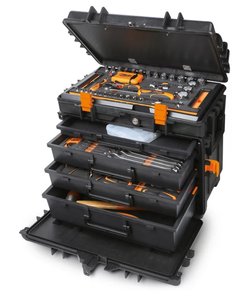 • Nagyfokú ütésvédelmet biztosító injektált polipropilén szerkezet. • A burkolattal rendelkező első rész 4 db 470x255 mm, kihúzható fiókot tartalmaz. 1 fiók 30 mm magas 2 fiók 60 mm magas 1 fiók 90 mm magas • Az első központi zár lehetővé teszi a felső és az első burkolat egyidejű zárását.