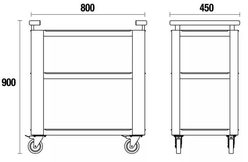 Jellemzők: • A középső polc kétféleképpen is rögzíthető • 4 forgókerék Ø 100 mm (kettő fékezhető) • Statikus terhelhetőség: 200 kg (3 polc között elosztva)