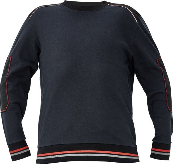 Férfi pulóver, pamut és PES kevertszálas francia frotír anyagból. Fésült, puha belső felületű. Kontrasztos fekete vállak, fényvisszavető szegéllyel. Dekoratív, figyelemfelkeltő varrás színes cérnával.