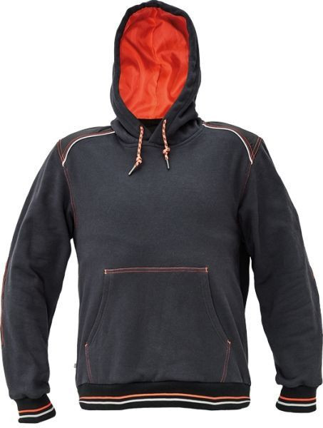 Férfi kabát, kenguruzsebbel és pamut-PES kevertszálas anyagból (french terry), belül fésült felületű. Megerősített váll- és könyökrész. A vállrészt és az oldalzsebeket fényvisszavető szegély határolja. Kötött kapucni, hi-vis béléssel és dekoratív varrással. Rugalmas, kötött passzé az ujjakon és az alján.