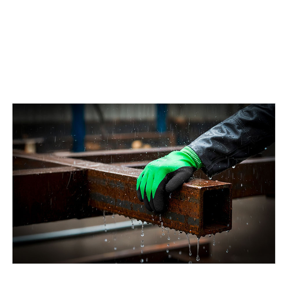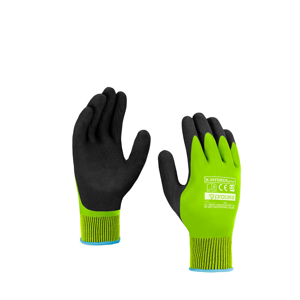 Az X-HYDROS GREEN védőkesztyű kiváló választás nedves, csúszós munkakörnyezetbe. A poliészter kötött alapanyagra teljes felületen felvitt zöld latex bevonat hatékony védelmet biztosít, míg a tenyérrészen található fekete habosított latex réteg extra tapadást garantál még vizes felületen is.