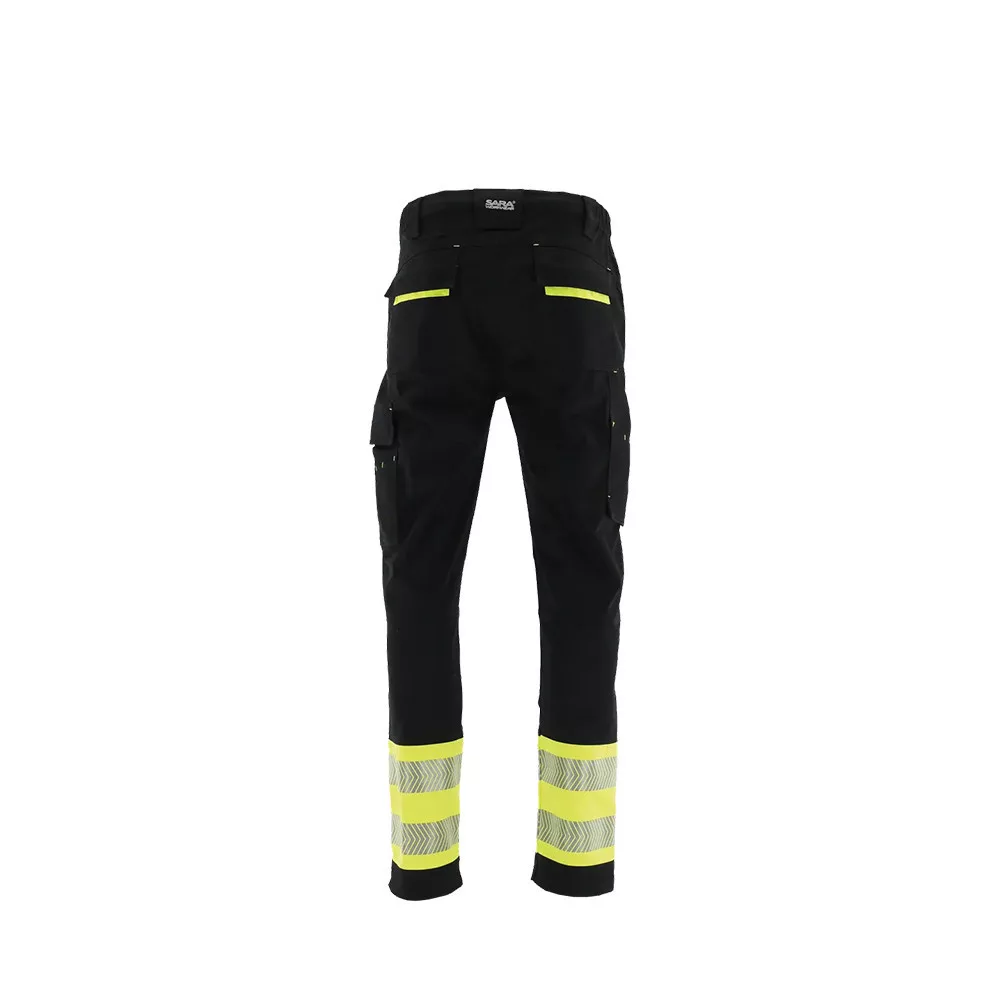 Karcsúsított szabás, rugalmas anyag, funkcionális kialakítás. A lábszárakon jólláthatósági modullal, és 5 cm széles szegmentált fényvisszaverő szalagokkal.