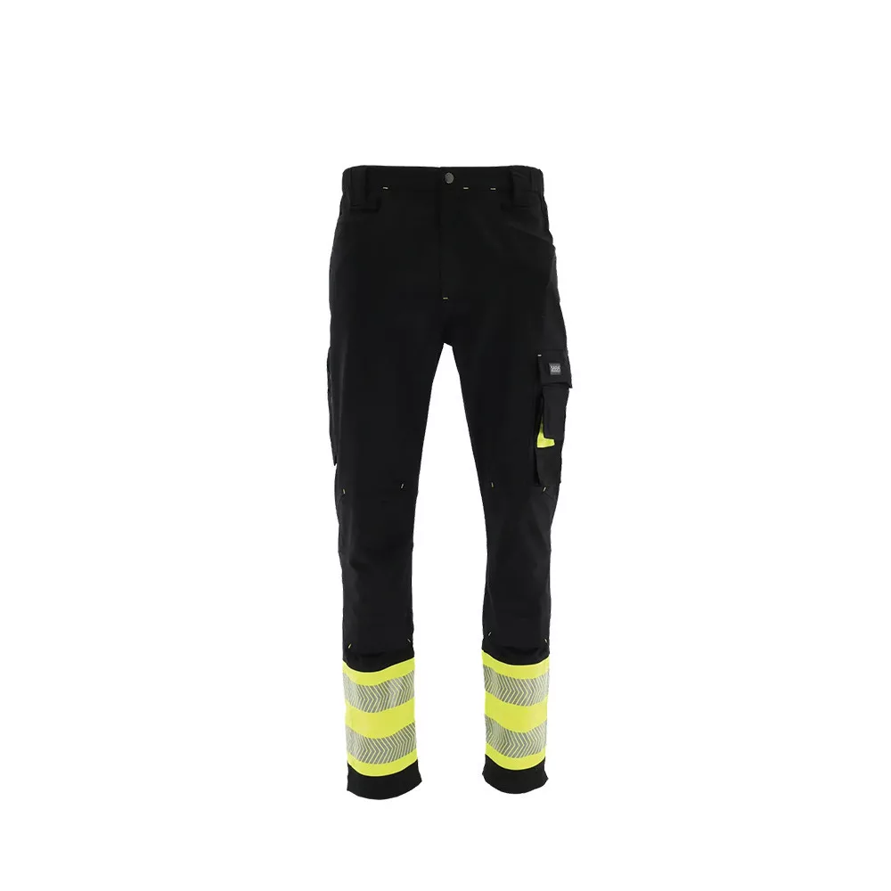 Karcsúsított szabás, rugalmas anyag, funkcionális kialakítás. A lábszárakon jólláthatósági modullal, és 5 cm széles szegmentált fényvisszaverő szalagokkal.