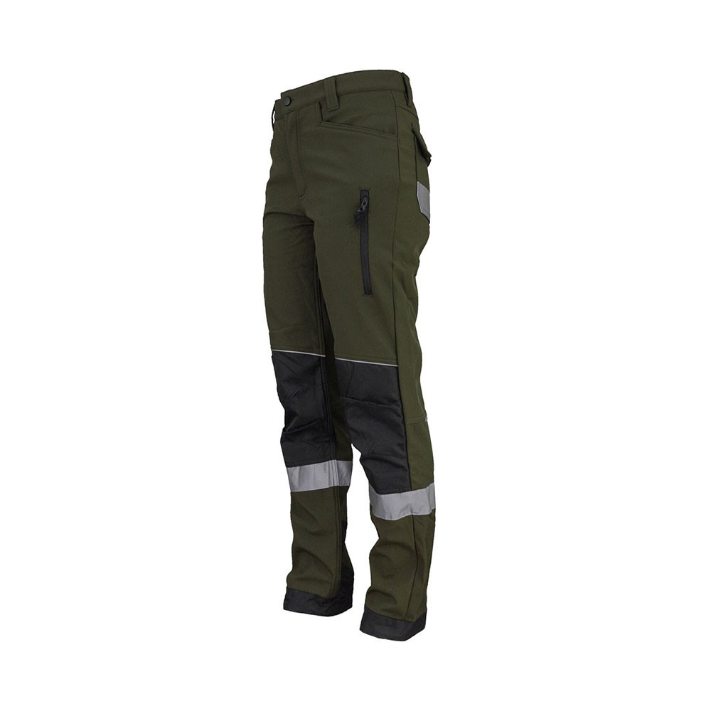 Szín: sötétzöld alapszín, fekete térd- és szárvédelem, valamint fényvisszaverő csíkok a jobb láthatóságért.