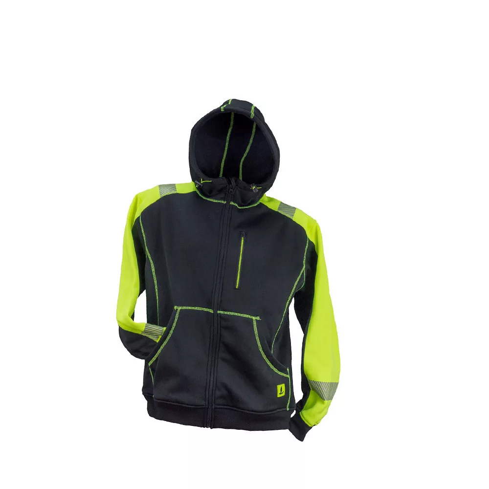 Praktikus és kényelmes férfi kapucnis pulóver. A vállakon és az ujjak végén jólláthatósági modullal, és 5 cm széles szegmentált fényvisszaverő szalagokkal.