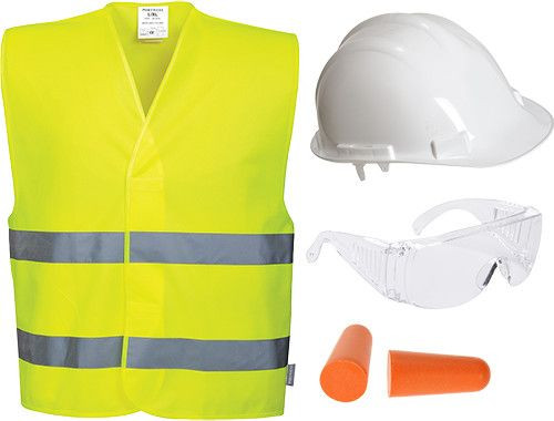 A Portwest Látogatói készlet gondoskodik arról hogy a látogatók láthatóak és biztonságban legyenek a munkaterületen.-PW50 védősisak X1-EP02 füldugó X2-PW30 védőszemüveg X1-C474 jól láthatósági mellény X1