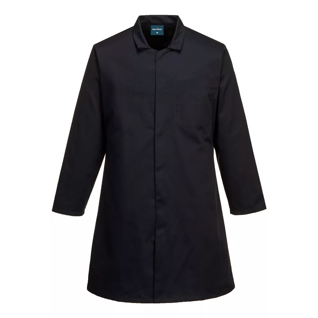Élelmiszeripari kabát egy belső zsebbel a megfelelő tároláshoz. Tartós Kingsmill polipamutból készült.