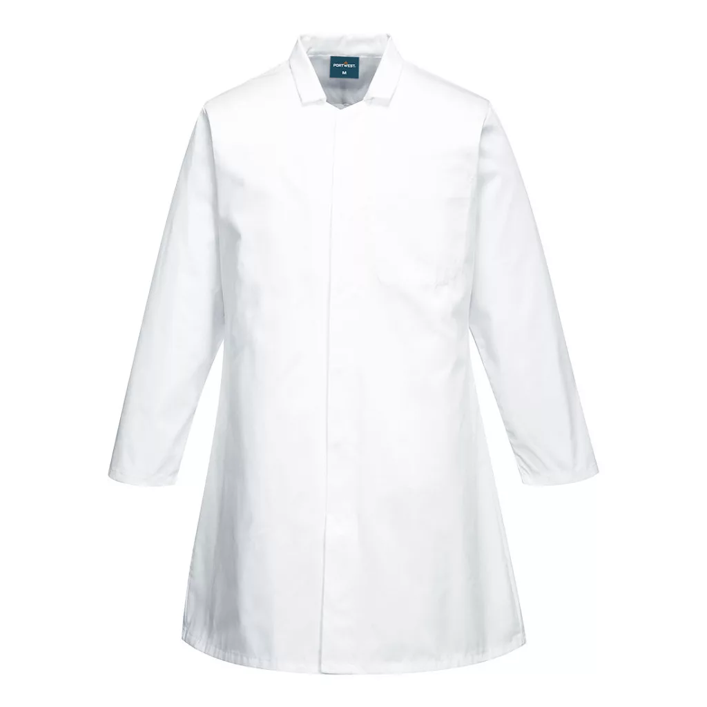 Élelmiszeripari kabát egy belső zsebbel a megfelelő tároláshoz. Tartós Kingsmill polipamutból készült.