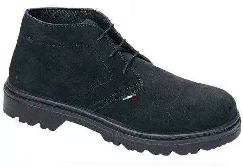 Munkabakancs orrmerevítő nélkül, olasz stílusú, antisztatikus, csúszásbiztos és üzemanyagálló PU/PU talp, energiaelnyelő sarok, felsőrész olasz velúrbőr.